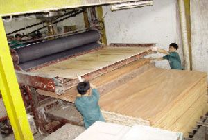 將挑選好的木皮單片涂上環(huán)保膠貼在地板基材上,再進(jìn)入先進(jìn)的熱壓機(jī)里進(jìn)行熱壓,即制成合格的多層實(shí)木復(fù)合地板板坯。