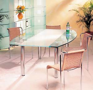 在搭配方面,玻璃餐桌能更好地與其他各式家具形成良好的搭配組合:簡潔明了的線條和通透的視覺效果使其突出而不突兀,精巧玲瓏的風格和別具一格的造型,在客廳的家具叢中獨樹一幟,閃爍著亮麗的光彩。特別是在自然光線的照射下更為搶眼,為居室增添截然不同的溫馨氣氛。此外,玻璃餐桌極易清洗,適應不同階層審美者的需要,并能為各種追求時尚的人群提供他們所要的個性需求。