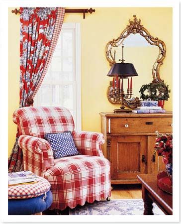 搭配建議:布藝沙發(fā)和窗簾的紅色,以及抽屜柜溫暖的舊木色,搭配淡黃色墻面,構(gòu)筑起溫暖而田園的意境??堪?、瓷器、窗簾上的青藍(lán)色圖案,則以冷色的點綴,平衡著視覺。