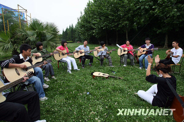 北川中學(xué)的“輪椅樂隊”正在校園草坪上排練(2009年5月4日攝)。北川中學(xué)有個“輪椅樂隊”很出名,成員是10個因地震致殘截肢的學(xué)生。2008年11月溫總理訪問北川中學(xué)時,他們曾為總理演奏。