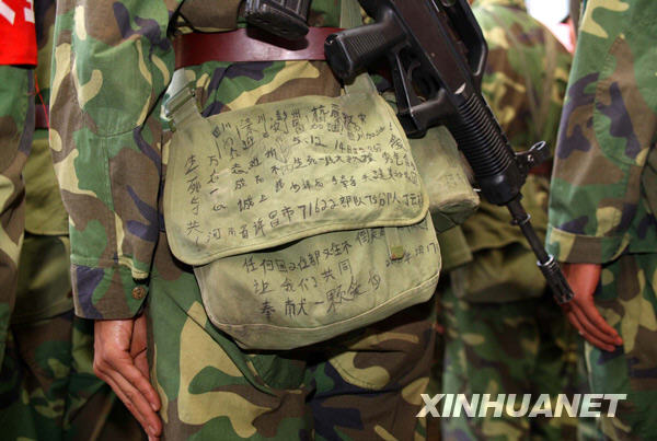 一名戰(zhàn)士的軍挎包上記錄了抗震救災(zāi)的誓言與信念(2008年7月22日攝)。當日,參與地震重災(zāi)區(qū)彭州抗震救災(zāi)的1000余名***官兵在成都火車站登車撤離,數(shù)千名遭受地震創(chuàng)傷、感受子弟兵關(guān)愛的災(zāi)區(qū)群眾趕往車站送別。新華社發(fā)