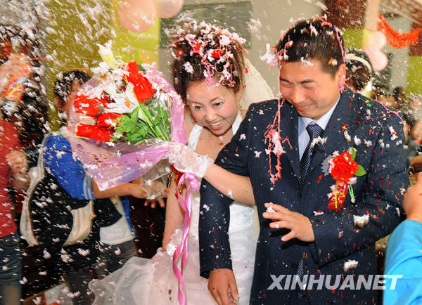 2009年5月12日,陳巖抱著新娘彭露穿過人群。當天,在地震中曾救出29人的志愿者陳巖在四川德陽市舉行了婚禮。