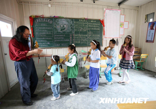 2009年5月1日,王曉春(左一)在指導(dǎo)孩子們進行隊列演奏。王曉春被映秀鎮(zhèn)村民稱為“超級志愿者”,他已年滿60,從2008年10月至今,他已為災(zāi)區(qū)群眾連續(xù)工作了200多個日夜。他用音樂的美,為災(zāi)區(qū)的孩子療傷,讓他們重拾信心,找回歡樂。