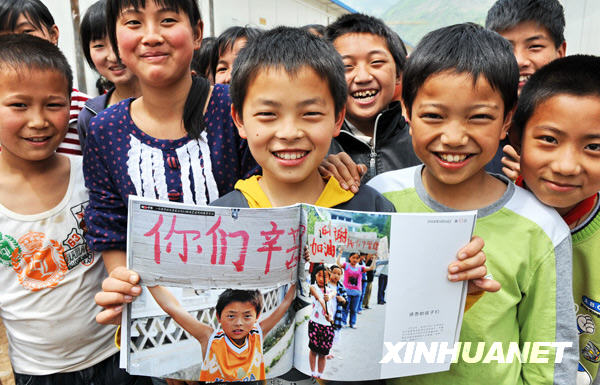 四川青川縣馬鹿小學(xué)的孩子們拿出印有他們照片的畫冊,請記者為他們留影(2009年4月21日攝)。2008年地震時,他們自發(fā)在公路旁打出自制感恩的標語牌,慰問援助隊伍,感動了無數(shù)人。