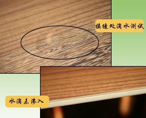 測(cè)評(píng)員在地板的接縫處滴水,靜置一段時(shí)間后將水擦干并將兩塊地板分開(kāi),發(fā)現(xiàn)鎖扣處幾乎沒(méi)有滲入水滴,可見(jiàn)這款地板的防潮性十分優(yōu)良。