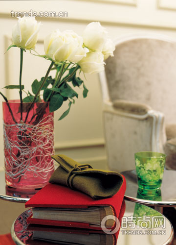 玫紅色的玻璃花瓶上金屬絲錯落盤繞,將白玫瑰映襯得格外浪漫,綠色印花水杯更顯得清新可人,紅與綠搭配出動人的和諧。