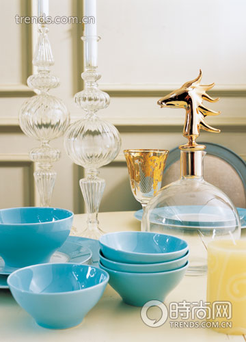 餐桌的線條帶著鮮明的復古風潮,在背景墻的襯托下有種歲月沉淀的優(yōu)雅韻味?;野椎闹魃{(diào)也給餐桌布置上留下更多揮霍色彩的空間。天空一般純凈的藍色餐具,嬌嫩的花朵搭配細頸寬口花瓶,華貴的金色酒杯以及晶瑩剔透的燭臺,讓古典餐桌霎時渲染上現(xiàn)代式的優(yōu)雅。顏色純美干凈的餐具會讓人有種想品嘗美食的沖動,為了營造更加純凈的氛圍,燭臺、酒杯與酒瓶都選擇無色透明的玻璃材質(zhì),而一點金色的點綴更增添了一份高貴氣質(zhì)。