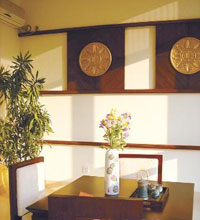 從玄關望去,整個廳堂呈橫放的長方形格局,空間錯落有致,分成玄關、客廳和茶室、餐廳三錯層。玄關是三錯層中最高的一層,站在這里,可以縱覽稍低層的餐廳、客廳和茶室,給人以大氣的感覺。餐廳夾在客廳與茶室的中間,客廳與餐廳處于同一平面,而餐廳在它們中間凸起,形成躍式餐廳,將原來一個整體空間自然隔成了三個空間,其間以玻璃材料作間隔,而餐廳與茶室之間只有空間的躍式感,如此形成彈性空間,既可充分享受空間的最大尺度,又不會因為空間過分開敞而顯得沒有層次,以致產生疏離感。