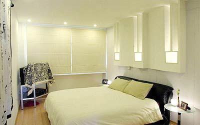 從房門進(jìn)入,就是睡床所在之處。這里的色調(diào)以乳白色為主,床頭墻壁的設(shè)計(jì),融入柔和的燈光,配上兩旁宛如小蠟燭的床邊燈,使得整個(gè)房間的氣氛變得額外祥和。