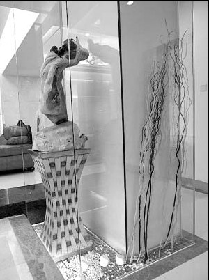 客廳與休閑區(qū)之間的柱子被玻璃及灰鏡所虛化,以獨具氣韻的根雕和鵝卵石、干枝組成裝飾,成為客廳與休閑區(qū)的對景。