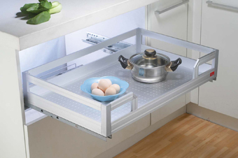 小型調(diào)料柜往往有不夠用的感覺,足足有一扇門板大小的調(diào)料拉籃容量驚人,連砧板都能放進去,置于爐臺側(cè)邊,成瓶的調(diào)料可以斜放,取用更方便快捷。