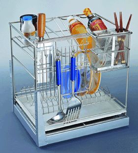 水槽下方的柜體空間很大,但空膛的利用率往往不高,因為有管道,不便于放擱板,要想有序地碼放東西,就要利用這種凹型抽屜拉籃,凹型口避讓了管道,寬大的抽屜讓取物更方便。