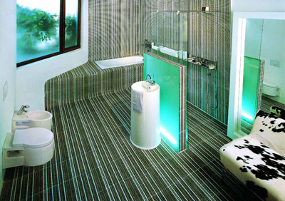 在沙丘中看到水流和金屬元素一定倍感清涼,博洛尼設(shè)計(jì)師利用人們對沙丘表現(xiàn)出灼熱和干燥的思維定式和代表清涼的元素進(jìn)行對比后產(chǎn)生的效果會使涼爽的感覺無限加倍。塑造清涼衛(wèi)浴空間利用對比的方法簡單易行。