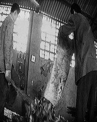 第二步:將竹編席涂上散發(fā)著濃濃甲醛味的膠水,將粉末鋪放在上面,再在竹編席上撒上鋸末;