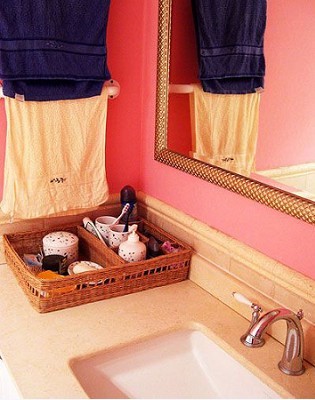 浴室中最理想的色調(diào)是粉色系,例如:粉紅、淡綠、淡藍(lán)及桃紅色等。其次則是奶油色系,或是一些中性色,如:黑色及白色。裝飾物及毛巾等配件則可選擇強烈的對比色系。