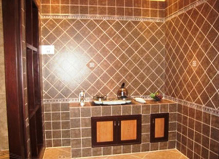 最好鋪貼啞光瓷磚,啞光瓷磚會使人感覺不好清洗,其實這是錯誤的,品質(zhì)好的啞光瓷磚不但非常容易清洗,而且其細(xì)膩、樸實的光澤更能顯示出主人高雅的審美觀,令廚房間的品位更加和諧、自然。
