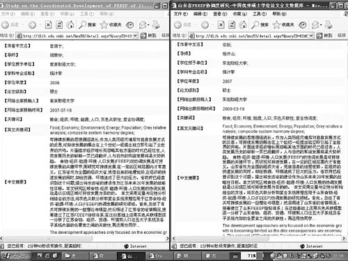 小蕭在下載完相關(guān)論文后,很快就注意到上述兩篇學(xué)位論文的題目相似性。他先看了山東那篇的摘要,再打開看江蘇那篇的,發(fā)現(xiàn)摘要很相似,于是開始對(duì)兩篇論文的內(nèi)容進(jìn)行認(rèn)真對(duì)比。小蕭發(fā)現(xiàn),盡管兩篇論文的數(shù)據(jù)和一些分析指標(biāo)排列存在一定的差別,但是論文的結(jié)論和其他部分完全一樣。他感到十分震驚,于是就想發(fā)到網(wǎng)上去。他還在網(wǎng)上查了一下該怎么舉報(bào)論文抄襲的,但沒查到,并且那天晚上他上不了“天涯社區(qū)”,所以就沒能在當(dāng)天把帖子發(fā)出來。