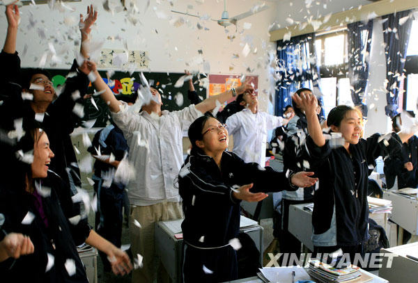 資料圖片:上海市進才中學高三學生在心理游戲課上將碎紙屑拋向空中,用輕松愉快的心態(tài)迎接高考(5月7日攝)。 新華社記者 陳飛攝