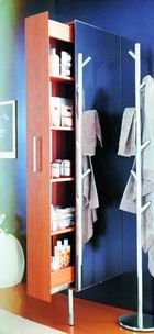衛(wèi)生間需要一些隔斷來進(jìn)行干濕分區(qū),那么這種像一堵墻似的豎柜就派上用場(chǎng)了,兩面貼上鏡子,可以進(jìn)行全身的裝束修正。拉開側(cè)面的把手,不得了,無論是大瓶的保濕水、精油,還是大袋的浴鹽、化妝棉,都整齊地碼放在后面的擱架上。注意安裝這種柜子不光要考慮本身的大小,還要預(yù)留出拉開后的體積。不建議面積小的衛(wèi)生間安裝。