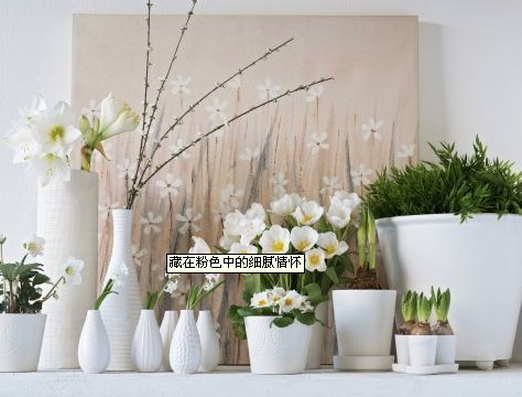 綠植花器。四處可見(jiàn)的粉色調(diào)難免會(huì)令人感到審美疲勞,因此,在居室空間中適當(dāng)點(diǎn)綴一些綠色植物,可以大大緩解這種視覺(jué)上的勞頓。在花器的選擇上,乳白色是最佳對(duì)象,它們和各種深淺不一的綠色結(jié)合在一起,有一種融雪初春的感覺(jué)。除了綠色植物,擺放一些白色花卉也對(duì)點(diǎn)綴空間大有裨益,比如水仙、百合等。
