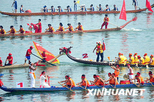 資料圖片:2008年6月6日,端午節(jié)前夕,湖北省秭歸縣龍舟選手在進(jìn)行傳統(tǒng)龍舟展演。 新華社記者 杜華舉 攝
