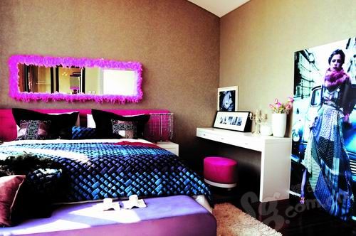 3.主臥室低調(diào)奢華的感覺主要靠軟裝來體現(xiàn),比如波希米亞風(fēng)格的床品、波斯風(fēng)格的靠墊、背景墻上粉色羽毛及水鉆床頭燈。這個房間有濃濃的英倫范兒,其實就是墻上的一幅背景畫創(chuàng)造成。這糅合了唯美、叛逆、優(yōu)雅、浪漫、迷醉的氣質(zhì),會讓每個人心動。