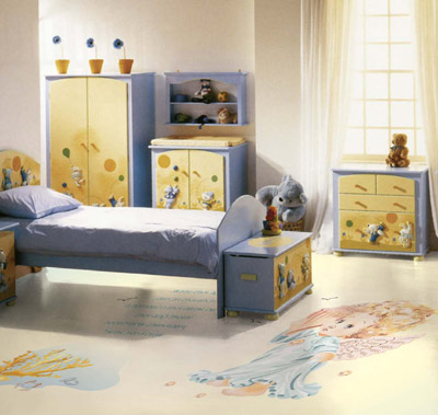 兒童房的裝修,地板是一個重點。因為孩子離開搖籃后,地板自然就成了他們接觸最多的地方。孩子將不管您為他們提供什么座椅,他們?nèi)匀幌矚g在地板上爬、躺。地板是他們最自由的空間。