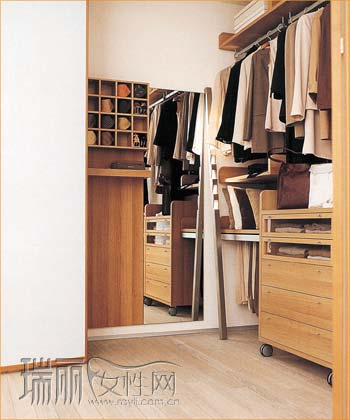 因?yàn)榭臻g本身較小,特別要注意的是需留出一定的活動(dòng)余地,不要一味貪圖衣柜的面積。另外,還要留出放穿衣凳的位置,方便更換下裝和鞋子,可以把穿衣凳放在柜子下方,用時(shí)拉出,穿衣鏡也可和某一柜門(mén)結(jié)合起來(lái)。