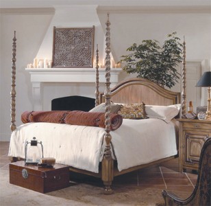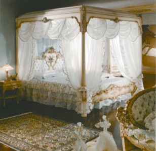 巴洛克式的臥房延續(xù)著法國(guó)宮廷式的美麗,紗簾掛床,絲質(zhì)掛墻,在“King Size”的睡床及貴妃椅周?chē)佉允止ぞ赖牡靥海@示出極度豐華的奢華。巴洛克風(fēng)格的睡床最大特色是將富于表現(xiàn)力的裝飾細(xì)部相對(duì)集中,簡(jiǎn)化不必要的部分而強(qiáng)調(diào)整體結(jié)構(gòu),就某一部分充分夸張。例如充分夸張床頭背板,以局部的花紋鏤空及各種裝飾元素做出強(qiáng)烈的舞臺(tái)效果;或是將回旋的螺紋縈繞在睡床直立的四柱上,平添一份華麗的味道。