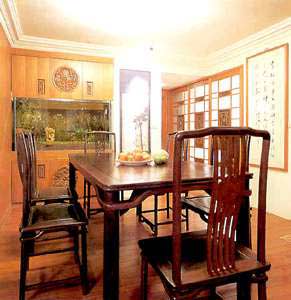 桌:中式餐廳中的桌子一般呈方形或長方形,以體現(xiàn)用餐人之間的尊卑等級關(guān)系。依據(jù)大、中、小三種規(guī)格,分別稱為“八仙”、“六仙”、“四仙”,“仙”指人數(shù),取其吉祥之意。將餐桌擺放在餐廳的中心位置,方正的造型顯得與四周環(huán)境相融合,亦有取意“正中人和”的說法。