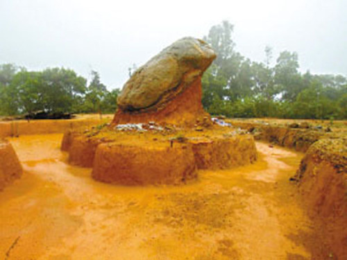廣州帽峰山有個傳說:帽峰古廟的香火之所以長盛不衰,是因?yàn)閺R后面有一只招財(cái)蟾蜍。去年年底,帽峰山森林公園管理處打算把帽峰古廟后面的山頂開發(fā)成古廟廣場,當(dāng)把大量黃泥土挖掘掉的時(shí)候,一塊大石頭突然出現(xiàn)。完全挖掘后,一塊形似旺財(cái)蟾蜍的天然奇石展現(xiàn)在世人面前,似乎正應(yīng)驗(yàn)了上述的古老神秘的傳說。