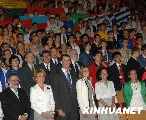 資料圖片:2008年7月21日,西班牙王儲費利佩(前左三)和王妃萊蒂西亞(前左四)等與參加國際數學奧林匹克競賽的選手合影。