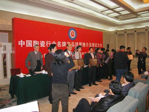 1月15日上午10點,“中國陶瓷行業(yè)名牌產(chǎn)品培育及頒證大會”在北京人民大會堂隆重舉行?!昂暧睢迸茐Φ卮u產(chǎn)品喜獲“中國陶瓷行業(yè)名牌產(chǎn)品”殊榮。 大會由中國輕工業(yè)聯(lián)合會副會長、中國陶瓷行業(yè)協(xié)會理事長楊自鵬主持。全國政協(xié)副主席周鐵農(nóng)以及中國輕工業(yè)聯(lián)合會、中國名牌戰(zhàn)略推進(jìn)委員會、中國陶瓷工業(yè)協(xié)會、陶瓷行業(yè)精英人士共200多人出席了大會。會上,中國陶協(xié)秘書長付維杰介紹了協(xié)會在培育陶瓷行業(yè)名牌產(chǎn)品方面的戰(zhàn)略規(guī)劃與實施情況。對獲得“中國陶瓷行業(yè)名牌產(chǎn)品”的包括建筑陶瓷、日用陶瓷、衛(wèi)生陶瓷、陶瓷機(jī)械、陶瓷裝飾材料(原料)等在內(nèi)的八大類別68個品牌頒發(fā)證書、牌匾。其中建筑陶瓷有21個品牌獲此殊榮。宏宇企業(yè)領(lǐng)導(dǎo)以及經(jīng)銷商代表參加大會并接受頒獎。