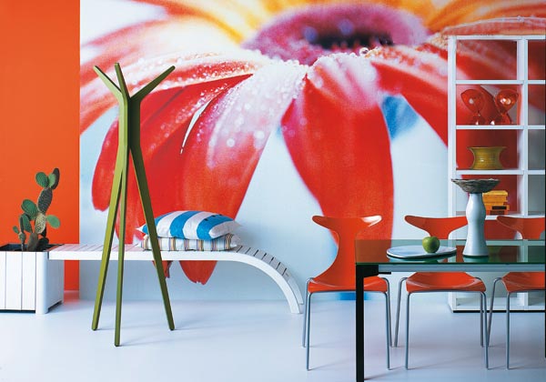 以曲線和色彩裝點(diǎn)房間各個(gè)角落。左起,內(nèi)層為鋅質(zhì)缸盆的花盆架(cm45×45×43高,215歐元),與弧形的Adamo長(zhǎng)凳相連(cm178×38×45高,390歐元,整體設(shè)計(jì)以白色上漆的野生松木為材質(zhì),Pircher出品),條紋靠墊(Linum出品,約25.40 歐元/個(gè))。HI!綠色白樺木掛衣架,顏色還有紫紅色、櫻桃色和黑色(Pascal Tarabay設(shè)計(jì),Diamantini&Domeniconi出品,cm55×55×172高,300歐元起價(jià))。同樣為綠色的水晶桌面,黑色涂層的鋼制結(jié)構(gòu),桌子的尺寸和顏色都可以選擇,同樣也可以根據(jù)需要加長(zhǎng)長(zhǎng)度(這里的尺寸:cm140×80×76高,966歐元)。紅色Delfy椅子,外殼為光亮的工程塑料材質(zhì)(Gino Carollo設(shè)計(jì),Ciacci Kreaty出品,有各種顏色選擇,144 歐元/把)。桌面上,白色陶瓷的 Zurbaran水果盤(Studio Sigla設(shè)計(jì),Terre Blu出品),細(xì)頸陶瓷瓶和小籃子(Sardegna Lab出品)。后面,用Wall to Wall組合模式制作的漆木書架(Poliform出品,這里的尺寸:cm105×32×197高)。架子上,兩個(gè)Dalu'燈的新版造型(Vico Magistretti 1965年設(shè)計(jì),Artemide出品,59歐元/個(gè)),陶瓷花瓶(Luca Scacchetti設(shè)計(jì),Terre Blu出品,140歐元)。采用Gerbera面料的巨幅墻布裝飾(Jannelli&Volpi出品,Magic Walls系列,共8塊裝飾布,整體尺寸cm372×270, 405.60歐元)