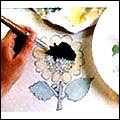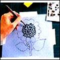 步驟四 在全部花紋上重復涂抹第一種顏色,等涂料晾干,上第二種顏色。把第二張蠟紙蓋在花紋圖案上,小心地把點化線與第一種顏色的輪廓線對齊,如步驟3那樣涂抹第二種顏色。