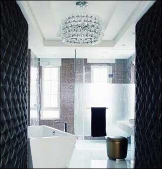 在這樣一個(gè)經(jīng)典空間里,就可以選擇設(shè)計(jì)風(fēng)格一致,但形態(tài)、色彩、質(zhì)感各異的家具。衛(wèi)生間干區(qū)的皮質(zhì)軟墻、濕區(qū)馬賽克的拼貼,造型感十足的玻璃質(zhì)吊燈以及線條明朗的潔具,它們都簡(jiǎn)潔而富有張力,共同打造了一個(gè)質(zhì)感豐富的空間。