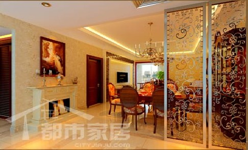 接下來看看設(shè)計(jì)師是如何“裝扮”這套新房的吧。之前我們提到了業(yè)主喜歡華麗的風(fēng)格,并且家里不時(shí)會(huì)舉行一些朋友聚會(huì),為了體現(xiàn)出開放和大氣,淺金色的簡約歐式風(fēng)格被選定為整體基調(diào)。大理石地面的運(yùn)用有助于提升居室的華麗感,而淺金色的花朵壁紙則賦予了居室貴族般的典雅氣質(zhì)。壁紙、大理石地面以及天花板的顏色都非常接近,在統(tǒng)一的基礎(chǔ)上又有一定的漸變,產(chǎn)生視覺上的延伸感,這樣可以一定程度上緩解層高很低的印象。除此之外,吊頂?shù)摹盎亍弊中伟继幚硪步o人以天花板的進(jìn)深感,讓人覺得頭頂?shù)目臻g有深淺層次。最后,強(qiáng)調(diào)墻面的豎線條是增強(qiáng)視覺層高的必殺技哦。