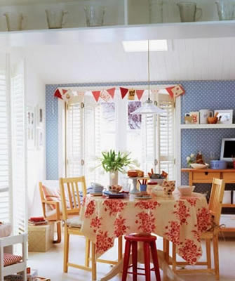 鮮明的白色、紅色和藍(lán)色將餐廳空間裝點(diǎn)得明凈、通透而又輕松寫(xiě)意。新英格蘭風(fēng)格的百葉窗門(mén)、圓點(diǎn)花樣的藍(lán)色壁紙和精制的白、紅色織物, 讓人輕易便歡快輕松起來(lái),那一排孩童的卡片更是讓家庭的溫暖瞬時(shí)散發(fā)出來(lái),令人陶醉。