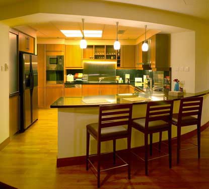 廚房中總是有些小角落。稍大的小角落,主婦們會(huì)擺一張小桌子,或幾把便于就餐時(shí)用的椅子,設(shè)計(jì)師建議選用折疊或長(zhǎng)度可調(diào)節(jié)的連柜餐桌,不用時(shí)將其折疊,而可疊加的椅子,則可存放于柜內(nèi)或桌底;稍小的角落安置推拉式高柜,這種儲(chǔ)藏能力很強(qiáng)的柜體大大減少了對(duì)空間的需求。