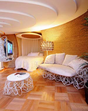 沙發(fā)、床都是定做的,主人很細心地把它們的支腳都配成了白色鋼絲纏繞的款式——整個房子如同大號的蠶繭,里面怎么能夠少了蠶絲呢?而電視的處理更值得稱道:省卻了大規(guī)模電視背景墻的空間,將它用鐵絲支架吊掛在空中,可以多方位旋轉(zhuǎn),無論洗澡、做飯還是座談、休憩,都可以隨時看到想看的節(jié)目,而且造價肯定比主題墻少。