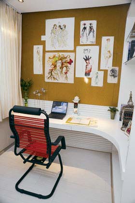 書房不大,墻面的裝飾畫讓整個書房充滿了時尚味道。一進書房門,整面墻都做成了書架,書架下放了一把休閑椅,是閑暇時看書用的,書桌沿墻面延伸到了左手墻邊,時尚又實用,可以看出設計師的用心。