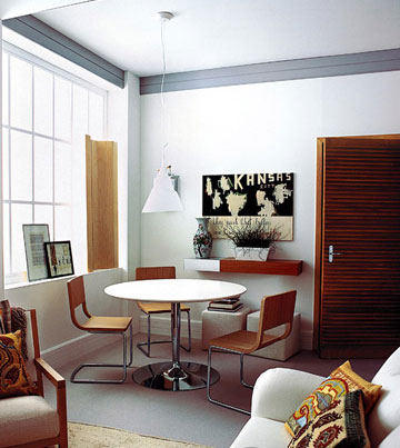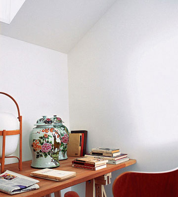 白色、灰色、原色的搭配似乎是一種小空間最為安全卻顯保守的解決方案,然而戈文的家卻并不因此顯得乏味和枯燥。他從古董店精心挑選的幾件東方彩繪陶瓷瓶被分別安排在了餐廳、客廳和臥室的角落;幾只古典圖案的刺繡靠墊隨意擺放在沙發(fā)和扶手椅上。另外,熱愛(ài)藝術(shù)的他也忘不了到巴黎的藝術(shù)區(qū)去淘購(gòu)幾張?jiān)瓌?chuàng)的裝飾畫(huà)和海報(bào),分別用來(lái)裝飾幾個(gè)大空間的白色墻面和窗臺(tái)。另外,盆栽植物也是必不可少的裝飾品,餐廳和臥室的幾盆綠色植物為戈文的公寓增添了一絲生機(jī),填補(bǔ)沒(méi)有花園的缺憾?!耙郧昂透改缸≡谝黄?,我常常幫助他們打理花園,現(xiàn)在雖然還沒(méi)能擁有自己的花園,但我一樣細(xì)心照料這幾盆小生命。比起晚間的電視節(jié)目,它們更能讓我體會(huì)到家的氣息,我會(huì)與它們一起共同生活和成長(zhǎng)?!备晡倪@樣解釋。
