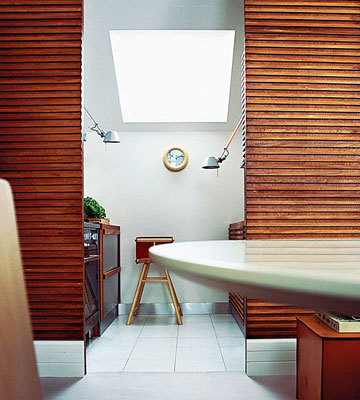 半開(kāi)放的廚房空間讓從斜屋頂窗射入的光線更充分地補(bǔ)充到餐廳空間。