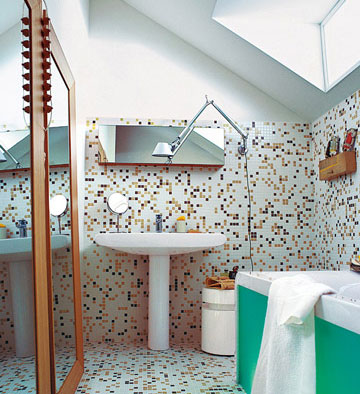 色彩在戈文家中的應(yīng)用不只局限在室內(nèi)的裝飾品上,令人意想不到的驚喜竟然隱藏在浴室中。8平米的浴室空間整體用白色和咖啡色系的馬賽克包裹,并且與浴缸側(cè)面的熒綠色形成對(duì)比,使整個(gè)浴室跳躍起來(lái)。在起居空間作為主角的原木材料在這里成為了配角,框起兩面落地的大鏡子。略加傾斜的鏡面又一次在視覺(jué)上擴(kuò)大了這個(gè)獨(dú)立空間,其實(shí)用性也有所體現(xiàn)。