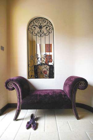 然而重點(diǎn)是鞋凳,紫色的絲絨面料讓人覺得溫暖并且與眾不同,仿古的造型和流線型的線條讓人感受到女性的柔情和嫵媚,女主人的紫色高跟鞋擺在凳子前,仿佛正訴說著屋內(nèi)的秋光。當(dāng)然,還有鏤空鐵藝后的客廳空間里遠(yuǎn)遠(yuǎn)的一抹暗紅,都顯示出低調(diào)中的華麗感覺。
