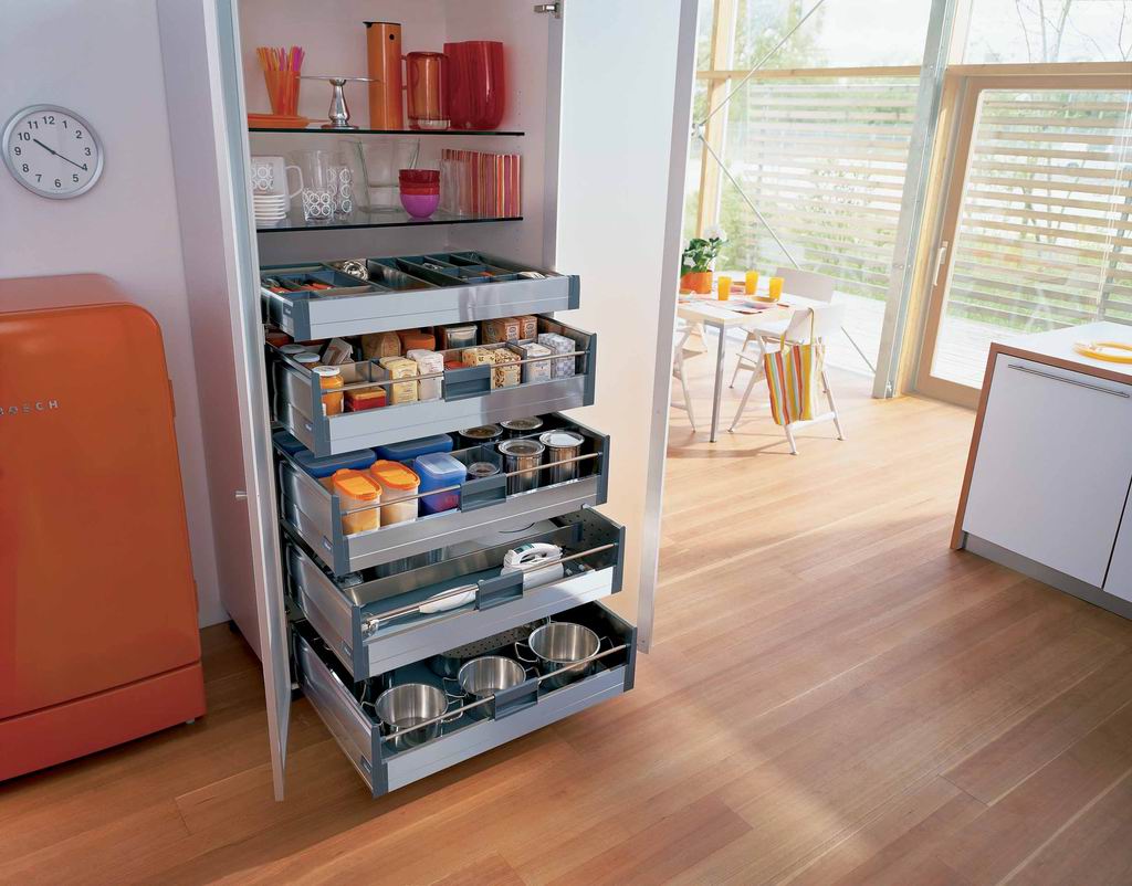 合理利用臺面下、櫥柜里的空間,櫥柜的抽屜如果放置體積小的物品,應盡量對分幾格,高度也應低一些。放小東西的抽屜,高度如超過10厘米,上面的空間會被浪費。臺面下如果剩下的空間很窄,由于臺面寬約50厘米,進深很大,東西放在里面很難取放。要想有效的利用里面的空間,可以設一個帶輪子的擱板架子放東西,推進去、拉出了很方便。