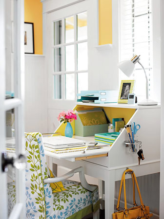 聰明女人的辦公桌一定是整齊而多功能的,這里可以掛起你的錢包或者公文包,處理電子郵件,把第二天要帶去公司的文件擱在這里,出門的時(shí)候也一定不會(huì)忘記。頂層的文件盒也是最明顯的地方,裝一些你想看得見(jiàn)、記得帶的東西,比如需要郵寄的信件。下面的文件夾裝一些經(jīng)常處理的文件,比如賬單。桌面上的托盤盒裝手機(jī)、ipod等小物件,盒子外圍可以用絲帶稍微點(diǎn)綴一下。桌子側(cè)翼用來(lái)放筆的牙缸架和掛鑰匙的S形鐵鉤功不可沒(méi),而桌邊掛衣鉤的出現(xiàn)讓手包和公文包在使用時(shí)垂手可得。