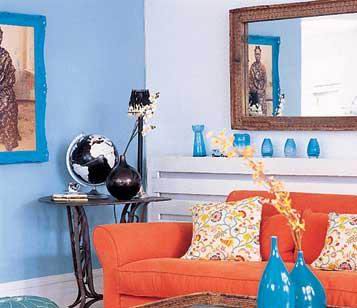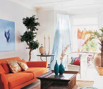 將橙色與綠松石色進(jìn)行大膽的搭配,可以呈現(xiàn)出一種令人震撼的視覺效果。橙色的大沙發(fā)強(qiáng)調(diào)了整個(gè)空間的主體色調(diào),沙發(fā)上圖案簡(jiǎn)單的花卉靠墊與橙色主調(diào)形成一種呼應(yīng)。泛白的綠松石色裝飾墻,延伸出另一種風(fēng)格的空間。薄紗窗簾使室內(nèi)的光線更加自然柔和,帶有戶外咖啡座風(fēng)格的藤條茶幾和扶手椅,讓人很自然地感覺到悠閑與愜意。碰上好的天氣,可以很方便地將他們搬到陽臺(tái)上。鐵藝小桌上穩(wěn)固的大號(hào)蠟燭臺(tái)和漂亮的古典式燈籠可以非常方便地為室內(nèi)或室外提供照明。
