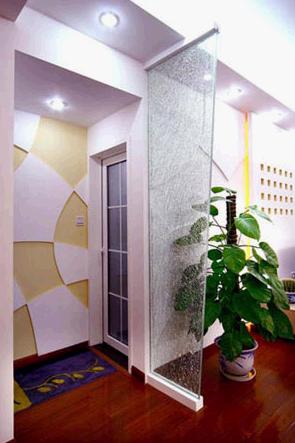 所以,折中的辦法是用玻璃屏風(fēng)來(lái)做間隔,用磨砂玻璃這樣半透半遮的材質(zhì),既在空間上起到間隔的作用,又可以借用半透半遮的特殊材質(zhì)所帶來(lái)的空間沿展的視覺(jué)效果。這樣既可以防止外氣從大門(mén)直沖入客廳,同時(shí)也可令狹窄的玄關(guān)不顯得太逼仄。