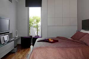由于屋主夫婦藏書豐富,主臥室還特別設計了一個頗具隱藏效果的書架,整體設計在簡單、實用之余,也不忘做出適當?shù)囊曈X美化效果。臥室有一道玻璃門,門外是一個小陽臺,擺上兩盆綠色植物,從室內(nèi)望出去十分養(yǎng)眼,恰似一幅綠色圖景。
